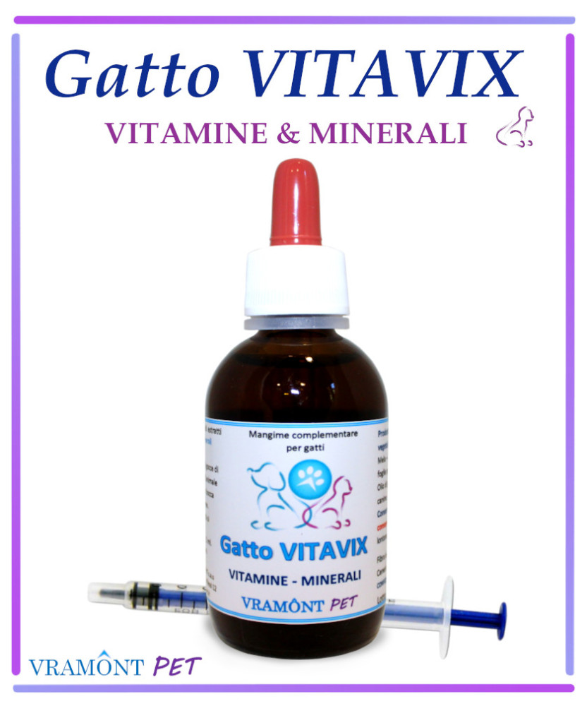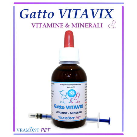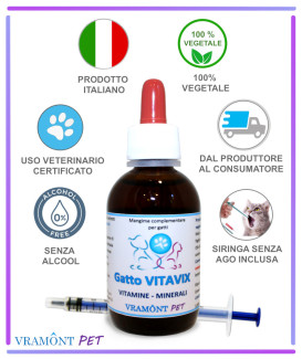 Gatto VITAVIX è naturalmente ricco di principi attivi, in soluzione liquida senza alcool, completo di siringa senza ago per una comoda somministrazione.